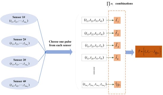 where denotes the delay of the -th pulse detected by sensor 1#. Let denote the sensor number. Then, set has a total of combinations, which form the set , as seen in Figure 5.