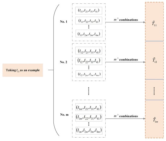 For each combination in , Equation (28) will give the calculation of the function values. The number of values is . Different combinations correlate to varying values of . It is necessary to determine the role of a certain pulse, for example . According to the combinations in Figure 5, appears in more than one set. All combinations containing should be extracted from , and then form a new collection , seen as Figure 6.