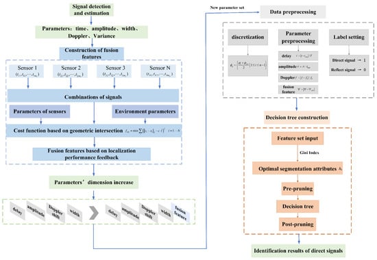 Recently, ML integrated with underwater acoustics has gained significant attention, which is a type of optimization method from the statistical perspective [,,,]. The decision tree (DT) technique is commonly used and efficient for classification in ML, depending on feature characteristics for tree construction [,,]. Literature [] investigated the identification method using the DT technique, depending on the independent judgment of the direct signal, abbreviated to S-DT. However, in S-DT methods, independent judgments restrict the utilization of effective information and lead to poor adaptability to complex underwater environments, especially when sharp interference or false alarm pulses exist. Hence, using features from multi-sensors may be a vital aid to enhancing the performance. Nevertheless, the process of signal detection and the estimation of various sensors are independent of each other, and the parameters cannot be directly employed for constructing decision trees.