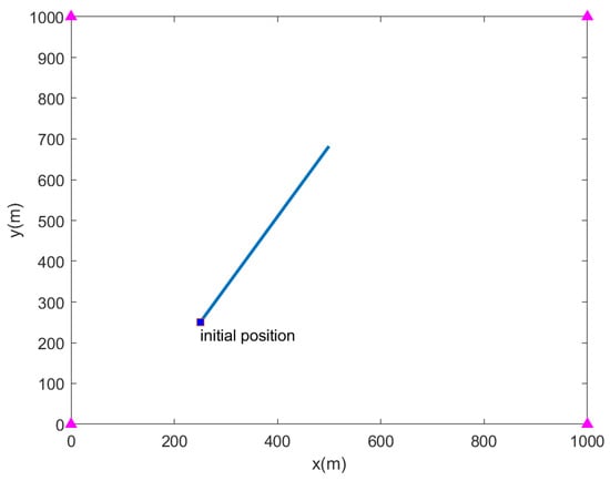 Assuming that the platform moves along the direction of a heading angle of 30° from the initial position (250, 250) m with a constant speed of 2 m/s, the platform’s maneuvering situation is shown in Figure 8.