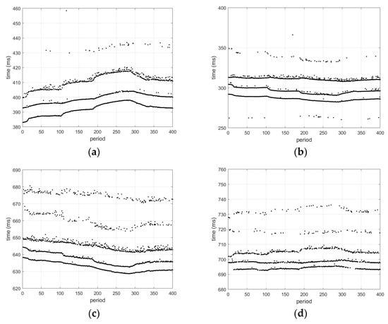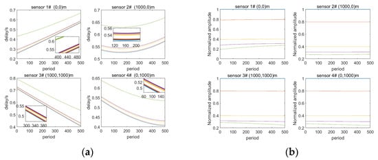 Measured delays of various buoys (a) sensor 1; (b) sensor 2; (c) sensor 3; (d) sensor 4.