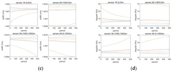 Parameters of received pulse (a) delay; (b) normalization amplitude; (c) width; (d) Doppler shift.