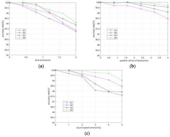 Analyzing Figure 10, it can be seen that the MFF-LF algorithm exhibits the highest level of sensitivity to variations in compared to other measurement errors, as indicated by the three graphs. With the gradual increase of , the accuracy rate of various sensors decreases to varying extents. Taking S1 as an example, if there is no , the algorithm can correctly distinguish between direct sound and reflected sound with 100% precision. However, when is 2 ms, the accuracy decreases to 95.27%. Then, upon studying Figure 10b,c, it can be seen that the MFF-LF algorithm is less affected by and . The algorithm can maintain an accuracy of 98.46% even when they reach 5 m/s and 4 m, respectively.