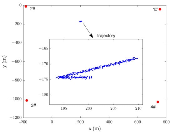 Four buoys were placed in a rectangular distribution to form a measurement area with coordinates 1# m, 2# m, 3# m, and 4# m. The depth of the transmitter on the target was 3 m. The trajectory of target is shown in Figure 12.