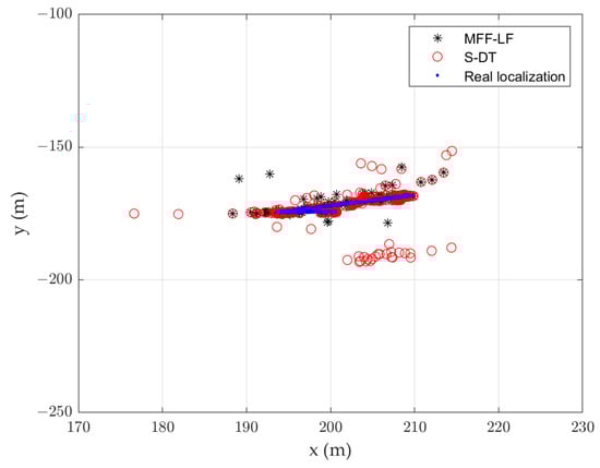 Analyzing Figure 13, it can be seen that, due to the effect of the multipath channel, each buoy will receive several pulses within the period, including direct sound and reflected sound. Then, we will analyze the performance of the MFF-LF method, and compare it with the S-DT method. Table 4 shows the accuracy rate of the two methods and the root mean square error (RMSE) of localization. Figure 14 shows the calculation results of the target trajectory.