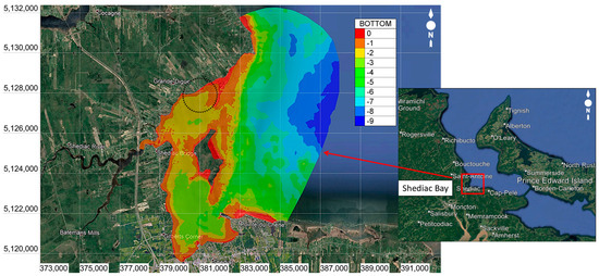 All elevation data presented here are expressed in the Canadian Geodetic Vertical Datum of 2013-CGVD2013. Based on the available and collected data, the bathymetry in Shediac Bay varies from −9 m to 1 m, but only from −3 m to 1 m within the inner bay, i.e., the part of Shediac Bay which is located behind the Grande-Digue sand spit. In Figure 1, bathymetry data are illustrated in red color standing for the highest elevation, and in dark blue color for the lowest elevation. The core modeled area (for calculations) is shown as a dashed circle. It covers about 3 km2 where the depth varies from −2 m to 0 m.