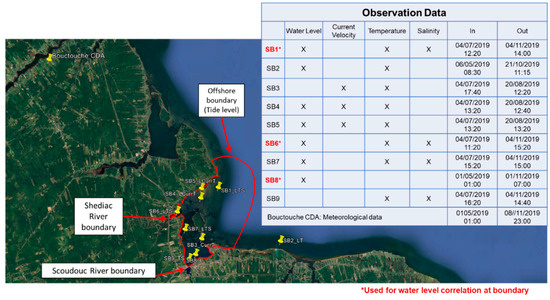 There were two sources of input boundaries used in our simulations: (1) salinity at the offshore area (station SB1) and at the Shediac and Scoudouc Rivers (stations SB6 and SB9); and (2) tidal fluctuation at the offshore area (SB1) and at these two river boundaries (stations SB6 and SB8). Data for salinity and water level fluctuations were collected during the period from 5 July to 4 November 2019, including fully observed data from the Dorian storm on 7 September 2019 (UTC).