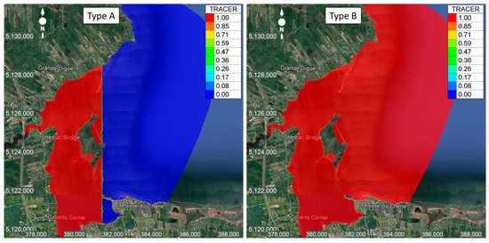 The renewal time varies from 36 to 180 h with the type A condition. When the breach is closed-off, i.e., when water cannot travel into the inner bay through the breach, the renewal time significantly increases, varying from 144 to 252 h. In an opposite manner, when the breach is enlarged, tracers will be quickly flushed away in less than 36 h. With the type B condition, it was observed that the renewal time becomes longer. The renewal time (a) varies from around 544 to 688 h for the current conditions; (b) increases to 904 h for a closed-off breach; and (c) decreases to approximately 200 h with an enlarged breach. With both type A and B initial conditions for the tracer concentration model, the results show a common tendency of renewal time. The simulations indicate that when the breach is closed, the renewal time will considerably increase compared to the current condition, i.e., the renewal time is four times longer. However, the area where water renewal is affected by the breach closure is limited to the inner bay, in the immediate vicinity of the breach itself.
