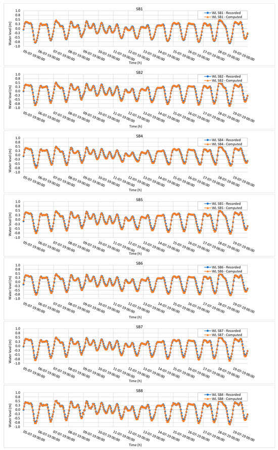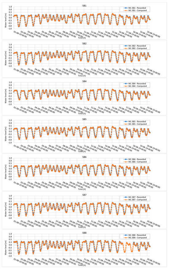 The model validation was conducted by using the data for the period from 1 to 20 August 2019. Similar to the Model Calibration section, water level, current velocity, and salinity were also the three parameters used in the validation process. The results have been extracted at nine different locations for comparison with observed data (see Figure 8, Figure 9 and Figure 10 and Table 4, Table 5 and Table 6).