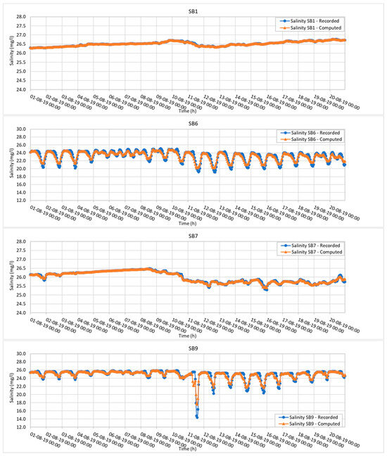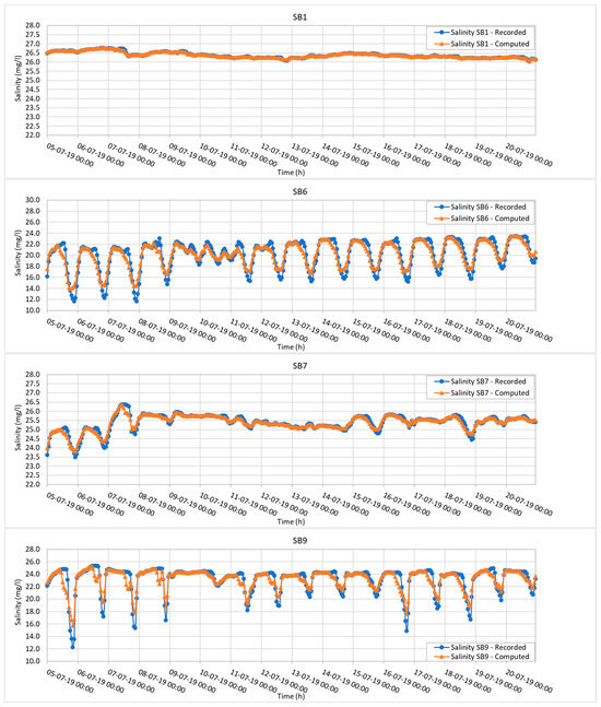 Model calibration: comparison between the computed and observed salinity.