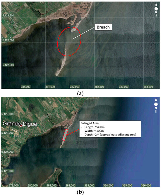 Shediac Island and the Grande-Digue sand spit shelter the inner bay from the more energetic waves of the Northumberland Strait (Figure 1). In this area, American oysters, blue mussels, soft-shelled clams, and quahogs are part of the benthic community, and shellfish harvesting is widespread while oyster farming is under development in the inner bay [14]. However, the development of a breach in the Grande-Digue spit in the mid-1980s [15] has raised concerns from fishers, bivalve farmers or aquaculturists, and coastal property owners. It was followed by several attempts to fill it or prevent its widening to ensure that the protection provided by the spit is maintained. It was only in 2019 and 2020 that a project was developed to restore the Grande-Digue sand spit, but since its emergence the breach has progressively widened to reach 410 m wide, though it is still shallow. Impacts from its presence have been reported by local operators such as fishers, mollusk farmers, as well as residents, and have included the following: seasonal or event-related variations in water temperature; seaward and landward sand transfer through the breach, leading to the hardening of the sea bottom in the inner bay and to the loss of shellfish habitats through sand burial; and exposure of the inner coast to higher energy waves.