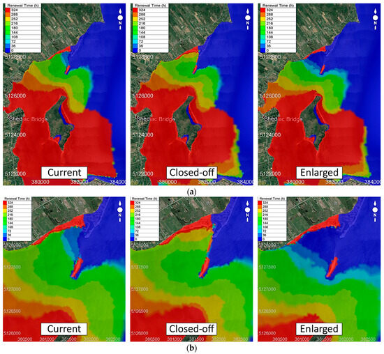 The entire and closer views of the renewal time for the type B condition are presented in Figure 15a,b. With the type B condition, it is observed that the renewal time becomes longer. The renewal time (a) varies from around 544 to 688 h for scenario 1 (current conditions) (Figure 15b, see the color scale); (b) increases to 904 h for a closed-off breach (scenario 2); and (c) decreases to approximately 200 h with an enlarged breach (scenario 3).
