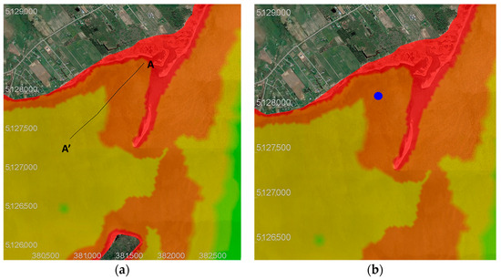 Figure 12a shows the location of the breach (the area within the red rectangle). The breach was considered as “closed-off” in scenario 2 or “enlarged” in scenario 3. The dimension of the enlarged breach is approximately 400 m in length, 100 m in width, and −2 m in depth (based on the average depth value of the adjacent areas to avoid shock waves). All other conditions remain the same as in scenario 1 except for the bottom elevation in the breach area, which is numerically “modified” according to each scenario’s conditions.