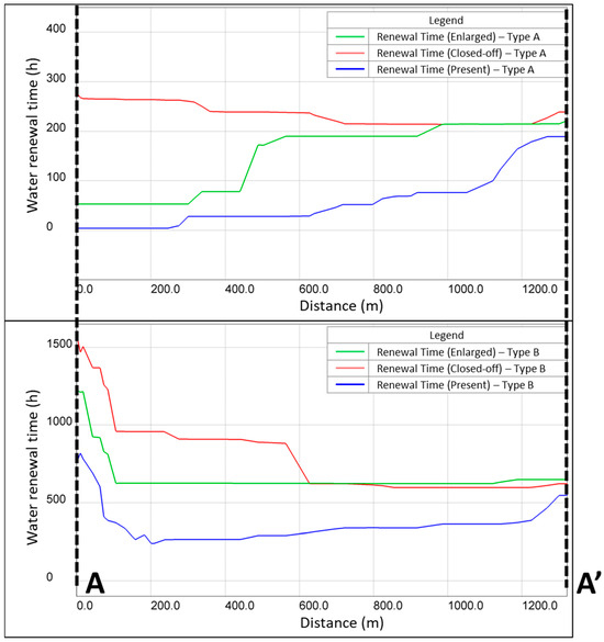 The comparison of the renewal time at the random cross section A-A’ between the two types of initial conditions is presented in Figure 17. The cross section shows the spatial variation of the renewal time from the inner bay towards offshore. The temporal evolution of the tracer and its difference in the three scenarios using initial condition types A and B are presented in Figure 18a,b, respectively. The temporal evolution of the tracer concentration at a certain point within the inner bay gives a clear picture of how much the changes at the breach site would impact the renewal time. From these graphs, we can see that in the closed-off breach (scenario 2—red line), the renewal time is longer than in the current conditions (scenario 1—blue line), while the opposite is true for an enlarged breach (scenario 3—green line).