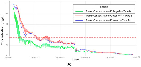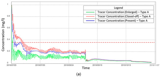 With both type A and B initial conditions for the tracer concentration model, the results show a common tendency of renewal time. Simulations indicate that when the breach is closed, the renewal time will increase considerably compared to the current condition, i.e., the renewal time is four times longer. However, the area where water renewal is affected by the breach closure is limited to the inner bay, in the immediate vicinity of the breach itself. For a more precise comparison, we illustrate the renewal time evolution at the random cross section A-A’ (Figure 16a), and a temporal change in tracer concentration at a random location in the inner bay (the blue dot in Figure 16b), in the three scenarios.