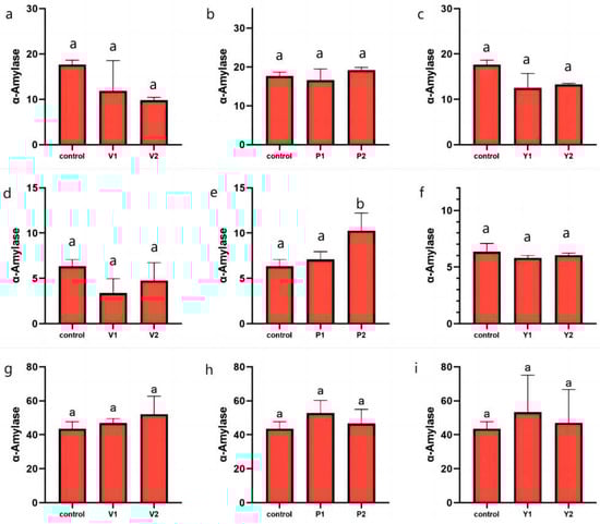 Digestive enzyme activity of P. monodon. (a): stomach α-amylase activity in vitamin B6 group; (b): stomach α-amylase activity in phytase group; (c): stomach α-amylase activity in yucca extract group; (d): intestinal α-amylase activity in vitamin B6 group; (e): intestinal α-amylase activity in phytase group; (f): intestinal α-amylase activity in yucca extract group; (g): hepatopancreas α-amylase activity in vitamin B6 group; (h): hepatopancreas α-amylase activity in phytase group; (i): hepatopancreas α-amylase activity in yucca extract group. Means with different superscripts were significantly different (p < 0.05).