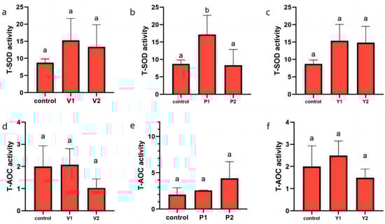 Antioxidant capacity of P. monodon. (a): T-SOD in vitamin B6 group; (b): T-SOD in phytase group; (c): T-SOD in yucca extract group; (d): T-AOC in vitamin B6 group; (e): T-AOC in phytase group; (f): T-AOC in yucca extract group. Means with different superscripts were significantly different (p < 0.05).