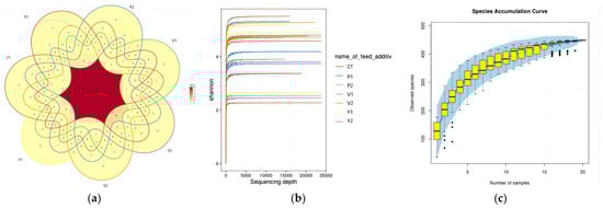 Composition and rationality analysis of intestinal microbial ASV in P. monodon. (a): Venn diagram; (b): Shannon index; (c): species accumulation box diagram.