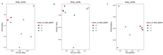 PCoA analysis on the basis of Bray–Curtis distance. (a): PCoA analysis chart in vitamin B6 group; (b): PCoA analysis chart in phytase group; (c): PCoA analysis chart in yucca extract group.