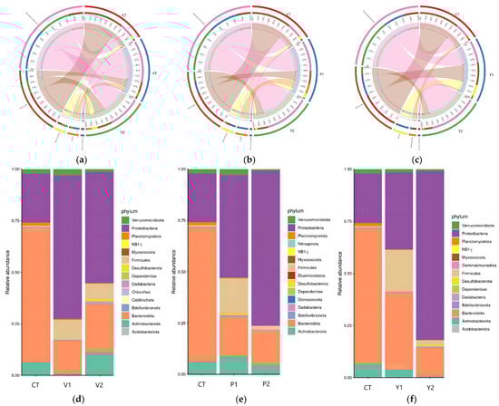 Intestinal microbiota composition of P. monodon. (a): Circos plot of vitamin B6 group; (b): Circos plot of phytase group; (c): Circos plot of yucca extract group; (d): histogram of relative abundance of species in vitamin B6 group; (e): histogram of relative abundance of species in phytase group; (f): histogram of relative abundance of species in yucca extract group.