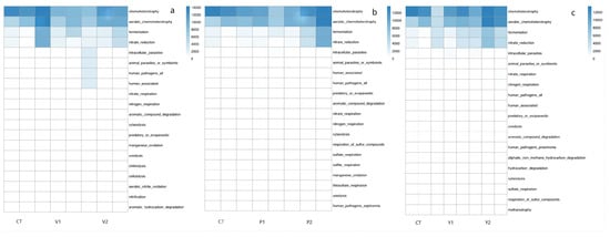 FAPROTAX functional abundance heat map in three groups. (a): vitamin B6 group; (b): phytase group; (c): yucca extract group.