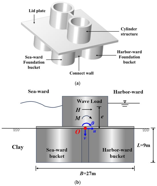 Breakwaters are important marine structures for protecting harbor facilities from severe storm wave loads. Caisson breakwater is one of the most widely used types of breakwater; however, it is often restricted in its application due to harsh conditions such as deep water and soft soil [1,2,3,4,5,6,7,8]. To address this issue, most recently, composite bucket foundation breakwater has become a competitive alternative [9,10,11,12]. A composite bucket foundation comprises four upside-down buckets combined by connecting walls, as illustrated in Figure 1. Compared with the traditional solid breakwater structure, the composite bucket foundation breakwater structure has a light weight, and the interaction between soil and the structure is strong due to the multiple compartments, making it suitable for application in coastal soft soil layers [12]. Meanwhile, it can be prefabricated on shore, and the installation is convenient, since the impact of filed construction can be controlled without cast-in-place work, etc. However, failure of the composite bucket foundation often occurs due to large displacements and excessive pore pressures when subjected to severe storm wave loads. Guo et al. [13,14,15,16] have conducted a comprehensive study about the structure and pipelines in the seabed. Therefore, understanding the performance of composite bucket foundation breakwater under storm wave loading conditions becomes considerably crucial for its design and construction in practice.