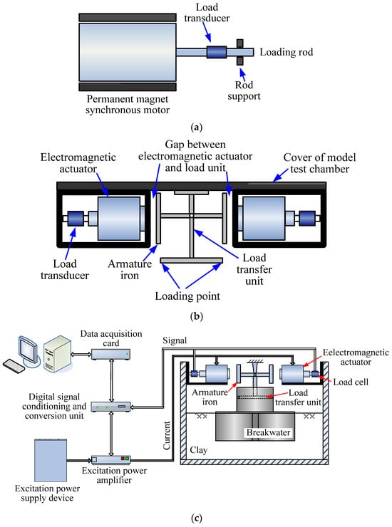 In the monotonic centrifuge test, the load was applied on breakwater through an actuator, which was driven by a low-speed permanent-magnet synchronous motor. Consequently, the monotonic load was applied under a constant displacement rate. A schematic of the device is shown in Figure 2a.