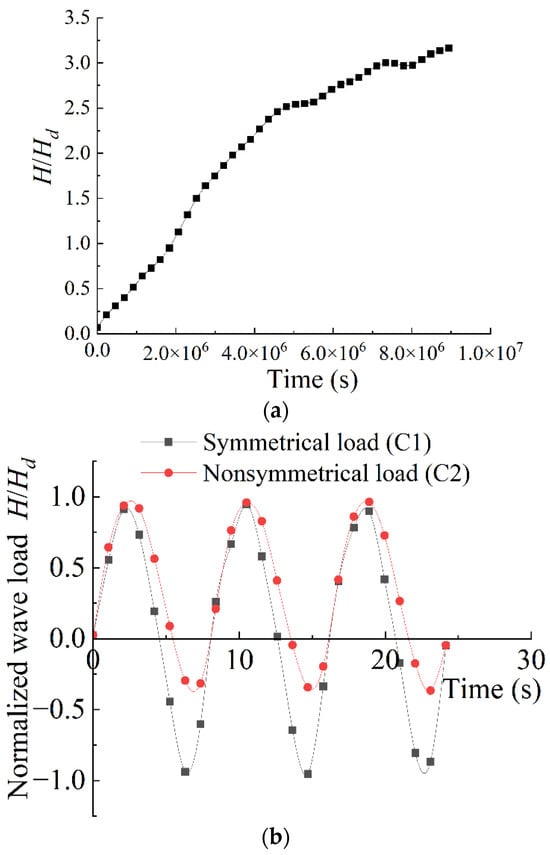 The monotonic load was applied to the breakwater structure by a monotonic loading device at a rate of 0.02 mm/s, and the horizontal load was normalized by the design horizontal load on the Tianjin Port site. The time history of the monotonic load is illustrated in Figure 3a. Cyclic loads were applied by non-contact cyclic loading at a period of 8.1 s, which is the same as Tianjin Port’s conditions. Two parameters, ζb and ζc, were employed to describe the characteristics of cyclic load: