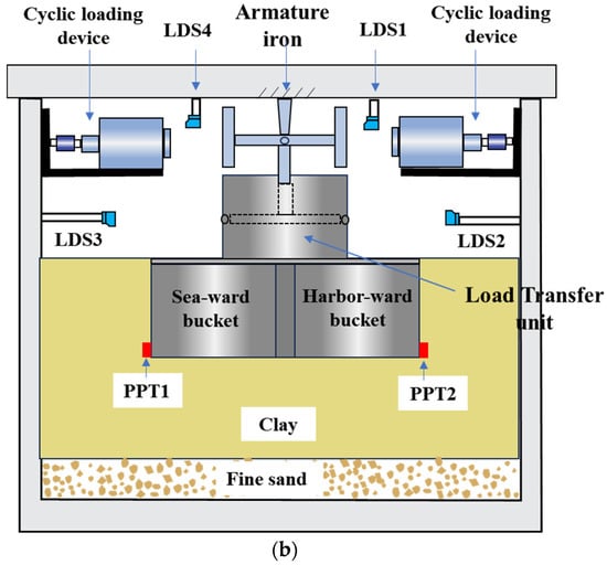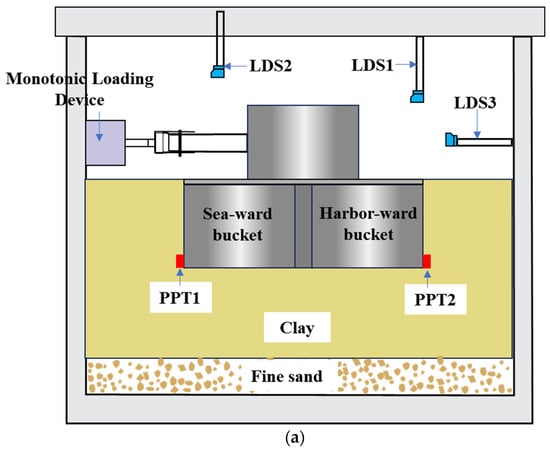 Schematics of the side elevation of the model setups in the monotonic and cyclic loading tests are presented in Figure 4. The displacement of the breakwater structure was measured by a high-performance laser distance sensor (abbreviated as LDS). Positive rotation and horizontal displacement are toward the harbor, and positive vertical displacement corresponds to settlement. Two pore pressure transducers (PPTs) were embedded in clay foundations outside the sea-ward bucket and harbor-ward bucket at a depth of 6 m, monitoring excess pore pressure under monotonic and cyclic loading conditions.