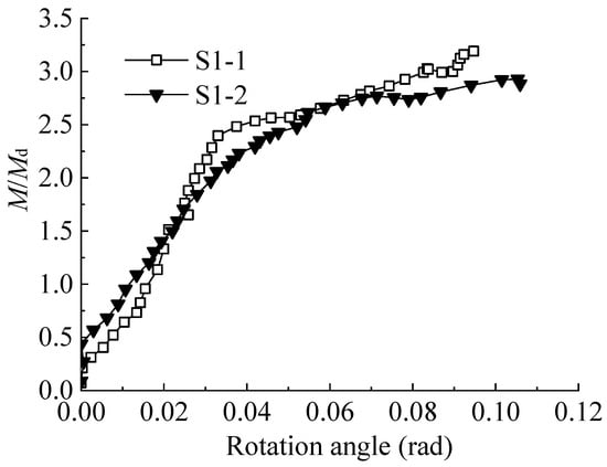 First, the repeatability of centrifuge tests was checked. Static model tests S1-1 and S1-2 were performed with identical experimental conditions, and the rotation angle responses for the two tests are presented in Figure 5. It is demonstrated that the parallel test shows good consistency in geotechnical performance. According to the locating inflection point method, the lateral capacity for the S1 model calculated by Xiao [40,49] is 2.66 Hd, which is in line with the centrifuge test result of 2.69 Hd. This demonstrates that the centrifuge experiment method is applicable in evaluating bucket foundation performance. In centrifuge models, the test condition on the bucket foundation can achieve an extreme failure state, and a more systematic study of the foundation can be conducted. For field practice models, the experiment condition is generally limited to a regular service state, which is restricted to describing the full performance of geotechnical structures.