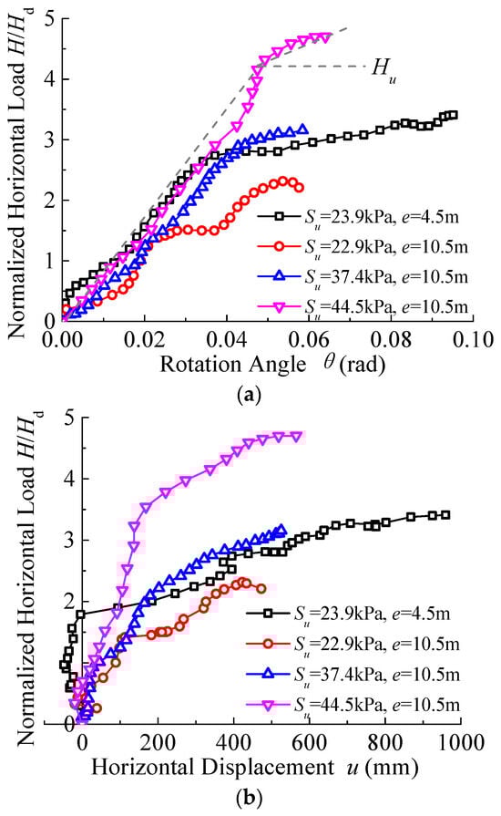 Under monotonic load toward the harbor-ward direction, the influences of soil strength and load eccentricity on the displacement of composite bucket foundation breakwater are shown in Figure 6. The load–displacement curve can be divided into two stages: the initial elastic and the plastic stages [50,51]. A distinct transition is observed in the load–rotation angle curve as the load increases significantly beyond the inflection point. The initial elastic range and plastic range are fitted with straight lines, and the value at the inflection point is defined as the bearing capacity of the breakwater [32]. The ultimate bearing capacity load is depicted in Figure 6a, denoted by Hu. When the soil undrained shear strength increases from 23 kPa to 44.5 kPa, the bearing capacity load (Hu) increases significantly from 1.31 Hd to 4.29 Hd. When the soil undrained shear strength remains 23 kPa, the ultimate bearing capacity load Hu decreases from 2.69 Hd to 1.31 Hd with the rise in loading eccentricity.