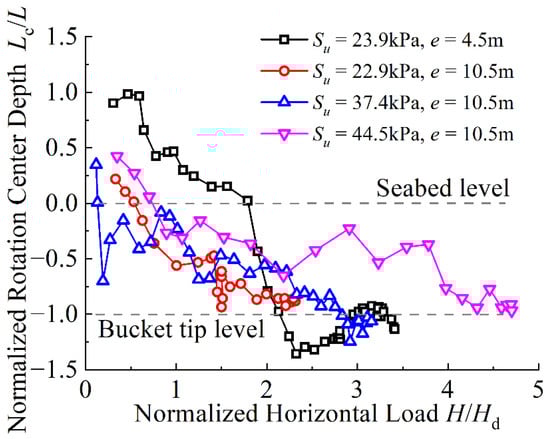 The relationship between the rotation center depth and the horizontal load of the composite bucket foundation is illustrated in Figure 7, which considers different load eccentricities and soil strengths. The test result shows that the rotation center is located above the seabed level when the horizontal load is small. As the momentum increases, the rotation center moves downward below the seabed level, and the rotation center stays stable around the bucket tip when the bearing capacity load is approached. Consequently, the depth of the rotation center can be considered to be located at a depth of L (L is the length of the bucket skirt) below the seabed level at failure [33,35].
