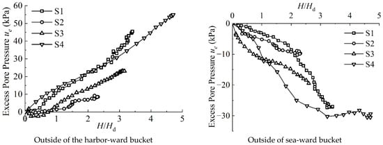 The variation in excess pore pressure with the loading increase is also plotted in Figure 8. The results show that excess pore pressure increases when soil strength increases. When soil strength rises from 23.9 kPa (test S2) to 44.5 kPa (test S4), positive excess pore pressure outside the harbor-ward bucket increases from 4.1 kPa to 38.6 kPa, and negative excess pore pressure outside the sea-ward bucket increases from 7.3 kPa to 30.0 kPa. Regarding the load eccentricity effect, the magnitude of excess pore pressure decreases when loading eccentricity rises from 4.5 m (test S1) to 10.5 m (test S2). In detail, positive excess pore pressure outside the harbor-ward bucket decreases from 29.6 kPa to 4.1 kPa, and negative excess pore pressure outside the sea-ward bucket decreases from 16.1 kPa to 7.3 kPa.