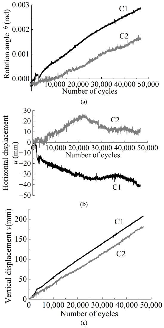 The relationship between three critical displacements (rotation, horizontal, and vertical displacement) and the cyclic loading process are depicted in Figure 9, and all displacement signs are illustrated in Figure 1b. Notably, rotation and vertical displacement roughly increased linearly with cycle number; the symmetric load test (test C1) has a larger rotation angle and vertical displacement than the non-symmetric load test (test C2). The development of rotation and vertical displacement are significantly affected by the loading magnitude. Horizontal displacement has different trends for two types of cyclic loading: the bucket foundations moves towards the sea-ward horizontally and increases with cycle number under symmetric loading condition. Regarding the non-symmetric loading tests, the horizontal displacement of the foundation increases towards the harbor-ward direction, containing two stages. In detail, the displacement increases when the cycle number is below 22,000 and decreases afterwards. It is evident that the displacement in the cyclic test is significantly smaller than in the monotonic test, indicating that the displacement of the breakwater might be overestimated when designed based on the monotonic test result.