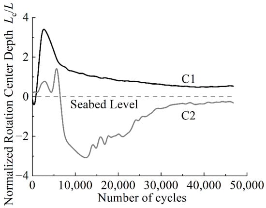 The variations in rotation center depth under cyclic loads are shown in Figure 10. It is demonstrated that the rotation center mobilized above the seabed level constantly in the symmetric load test (C1); however, in the non-symmetric load test (C2), the rotation center moved downward below the seabed level after about 7000 cycles. After about 30,000 cycles, the rotation center depth came to a stable stage, approximately 0.5 L above seabed level in the symmetric test and 0.3 L below the seabed level in the non-symmetric test. The movement of the rotation center in cyclic tests is complicated, and has upward and downward tendencies. Specifically, the rotation center would rise above the seabed level in symmetric centrifuge tests, while it would move downward from the original seabed level in non-symmetric tests.
