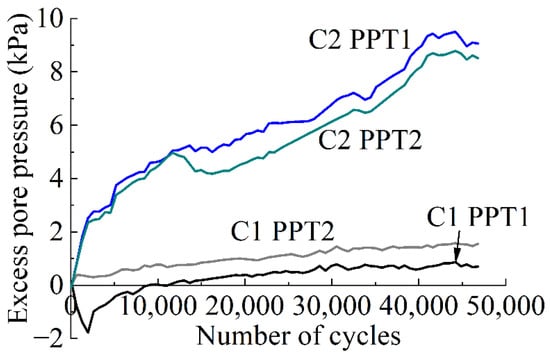 The excess pore pressure developments in clay foundations around buckets at a depth of 6m are presented for the symmetric load tests (test C1) and non-symmetric load tests (test C2), as shown in Figure 11. It was observed that positive excess pore pressure was generated outside both sea-ward and harbor-ward buckets under cyclic loading conditions, except that a small negative value was monitored outside the sea-ward bucket of the C1 test at the initial loading stage. The excess pore pressures for both tests increased significantly with the increasing load cycles, and the increase in excess pore pressure under non-symmetric loading was higher than under symmetric loading. In the non-symmetric test, the excess pore pressures outside sea-ward and harbor-ward sides attained 9.1 kPa and 8.5 kPa, respectively. When the bucket foundation was subjected to a symmetric load, the pressures were registered with minimum values of 0.7 kPa and 1.5 kPa, respectively. The variations in excess pore pressure demonstrate that non-symmetric loading would lead to considerable pore pressure, indicating that a more robust interaction was developed between the bucket foundation and surrounding soils. This is also consistent with previous observations of rotation centers in non-symmetric conditions. When the rotation center moves downward, the deep soils provide more resistance in sustaining the cyclic loading, and the horizontal displacement can be restricted considerably. In addition, it was found that the magnitude of excess pore pressure at the sea-ward (PPT1) side is close to that at the harbor-ward (PPT2) side for both symmetric and non-symmetric load tests.