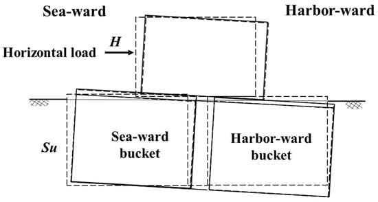 The failure mode of bucket foundations under monotonic load is further discussed to interpret the response of the bucket foundation. A sketch of foundation displacement for test S1 is illustrated in Figure 12. Under horizontal load, the breakwater rotates and moves horizontally toward the harbor side, and the harbor-ward bucket settles vertically. While the sea-ward bucket heaves, it tends to uplift with soil, and the harbor-ward bucket compresses with surrounding soil. The displacement pattern for a bucket foundation is composed of three components: rotational movement, horizontal movement, and vertical movement. As listed in Table 4, the displacements, considering different soil strength and load eccentricity, are generalized. In test S1 (soil strength 23.9 kPa and load eccentricity 4.5 m), the rotational angle, normalized horizontal displacement, and normalized vertical displacement were 0.035 rad, 0, and 0.023, respectively, which indicates the failure mode of test S1 is a combination of rotational and vertical movement. When the load eccentricity increased from 4.5 m (test S1) to 10.5 m (test S2), the horizontal displacement increased significantly, expressing that the failure mode converted to a combination of rotational, horizontal, and vertical movement. When soil undrained shear strength increased from about 23.9 kPa (test S2) to 44.5 kPa (test S4), the rotation angle and horizontal displacement continuously increased, and vertical displacement decreased considerably. This indicates that the failure mode was converted to rotational and horizontal movement, as soil undrained shear strength increased two times from test S2 to test S4.