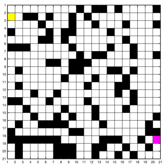 The working environment of the USV in this paper is set in a two-dimensional space. In the two-dimensional environment, when setting obstacles, the obstacle is expanded to the maximum diameter of the robot. At the same time, the robot is regarded as a point mass to simplify the complexity of the problem under the premise of ensuring safety. The grid method is easy to implement and has a clear and direct path display. Therefore, the grid method is used to model static spatial two-dimensional spaces [33]. The grid method model is shown in Figure 1. The coordinates are set with the upper left as the origin, from left to right as the positive direction of the x-axis, and from top to bottom as the positive direction of the y-axis. Each grid length is marked as the unit length and is set as unit 1. Starting from the upper-left corner, it is marked as serial number 1. The serial numbers increase sequentially from left to right and from top to bottom. The white grid in the figure is the reachable grid, the black grid is the obstacle grid, the yellow grid is the starting point, and the red grid is the endpoint. The mod() function is used for modulo (remainder) operations. Let the grid serial number be c, and let n be the number of grids in each row and column. The ceil() function represents rounding up. The correspondence between serial numbers and coordinates in Figure 1 is shown in Formula (1).