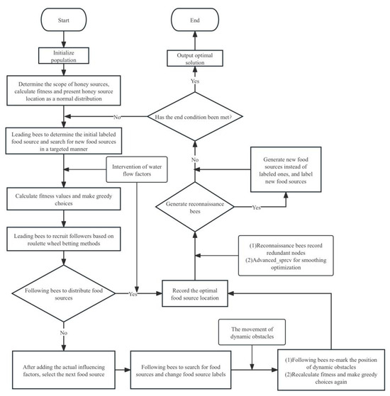 The bee colony algorithm (ABC) is an optimization technique that mimics the clustering intelligence observed in honey bee foraging behavior. It does not require explicit knowledge of the problem’s specifics; rather, it relies on comparing the relative advantages and disadvantages of the problem. Through the local optimization efforts of individual bees, the global optimal value can be highlighted within the colony, resulting in a faster convergence rate. The overall path-planning process can be conceptualized as bees extracting honey from a map and sharing information about honey source locations. Three distinct types of bee colonies follow distinct foraging rules, ultimately converging on an optimal path that effectively avoids obstacles. The algorithm’s overall flow is summarized in Figure 2 below.