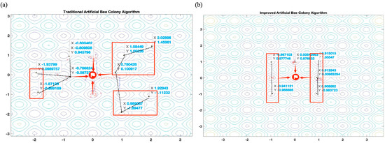 Optimization of bee colony motion using traditional artificial bee colony algorithm and improved artificial bee colony algorithm.