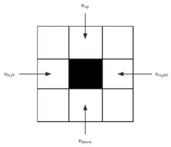 In the actual motion process of the robot on the water surface, the robot is inevitably affected by the water flow. In a two-dimensional grid map, the general choice is to simulate the water flow in four directions relative to the robot, as shown in Figure 6, where the water flow velocities from the four directions are represented by (clockwise from top to bottom) .