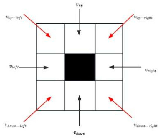 This is not considered in actual scenes, as the actual influence of the water flow is not limited to four directions, so the remaining four positions are considered the actual water flow constraints, as shown in Figure 7, where the water flow velocities from the four new angle directions are represented by (clockwise from top right to top left) .
