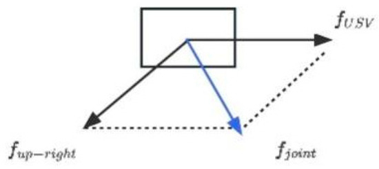 It can be seen from Figure 8 that the direction of the resultant force acting on the USV is not the desired direction of the USV’s movement in the ideal state. Therefore, a direction adjustment is needed. The direction adjustment constraint formula is shown in Equation (17). Based on Figure 8, a new USV direction model is established, as shown in Figure 9. The figure contains different forces, with , indicated by the red arrow, indicating the actual forward force of the USV after two combined forces.