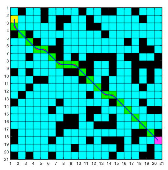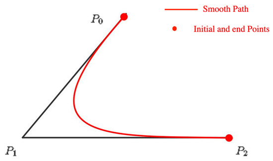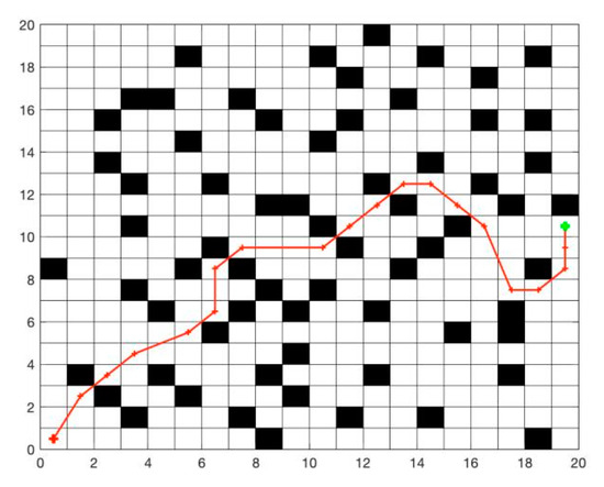 In this formula, B(|a, …z) represents the B-spline with nodes a, …, z. n is the number of coefficients in c, i.e., [d,n] = size (c). The parameter interval filled with uniform sampling points tt is [k/2 …(n − k/2)]. The output is composed of the array f(tt). After the smooth optimization is improved by sprcv based on Bezier smoothing, it ensures that the robot can successfully avoid obstacles and the path is smoother, as shown in Figure 12.
