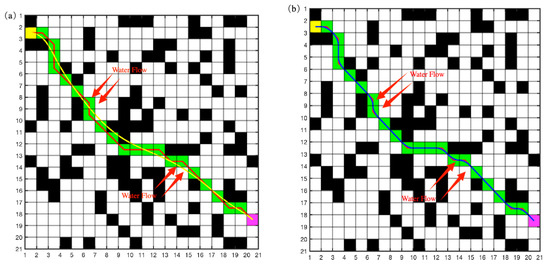 The traditional artificial bee colony algorithm has strong global optimization ability; it can adjust parameters adaptively and has a certain tolerance to parameter changes. It also exhibits good robustness in the two-dimensional water environment. In this paper, considering the unpredictable obstacles in the actual water environment and the impact of the water flow on the robot’s motion state, a dynamic obstacle avoidance strategy was integrated into the traditional bee colony algorithm, and a water flow correction function was added to ensure that the USV can still reach the target point position after being impacted by the water flow and smooth the path based on improvement. The red border and the black dashed line in Figure 3 represent the bee colony’s optimization area and the bee colony’s actual movement direction, respectively. The red arrow indicates the final decision of the bee colony in the next optimal position. As shown in Figure 3a, the traditional artificial bee colony algorithm’s bee colony is greatly affected by water flow during the process of searching for the next optimal point. The landing points are relatively random, and the bee colony is unable to decide on the impact of the water flow while finding the target point, resulting in the “lost” state of its motion trajectory. As shown in Figure 3b, under the resistance of the water flow, the movement trajectory of the improved artificial bee colony algorithm shows a relatively “unified” state. Meanwhile, the improved bee colony can reduce the impact of the water flow and find a better landing point after resisting the water flow without randomly appearing landing points.