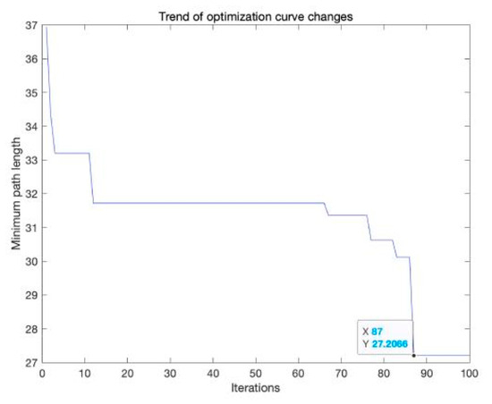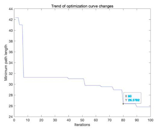 In the obstacle avoidance process of static obstacles, the updating of the population and the honey source will affect the search by honey bees to the target point, which leads to a fluctuation in the iteration times needed for the search for the optimal path in the traditional bee colony algorithm. As shown in Figure 16, under the premise of avoiding static and dynamic obstacles, the traditional bee colony algorithm finds the shortest path after 87 iterations. After improving the algorithm, it can avoid obstacles in dynamic environments and find the shortest path after 80 iterations under the premise of avoiding both static and dynamic obstacles.
