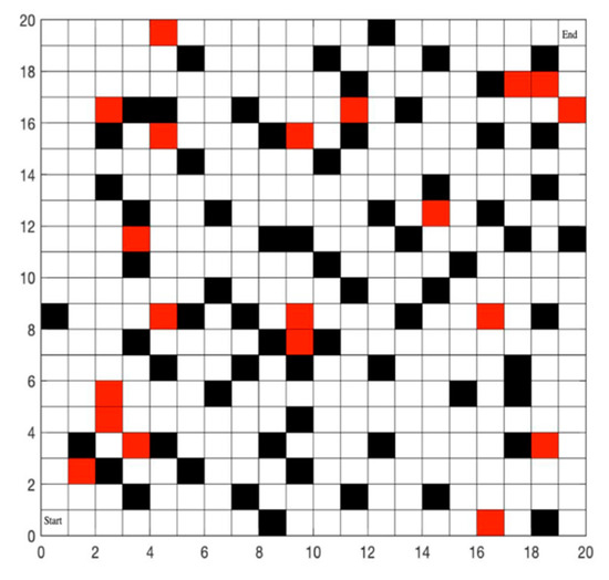 Figure 18, Figure 19, Figure 20 and Figure 21 show the comparison of obstacle avoidance times for the two algorithms in different environments. Each grid map represents static obstacles in black and dynamic obstacles in red. The dynamic obstacles move randomly in four directions.