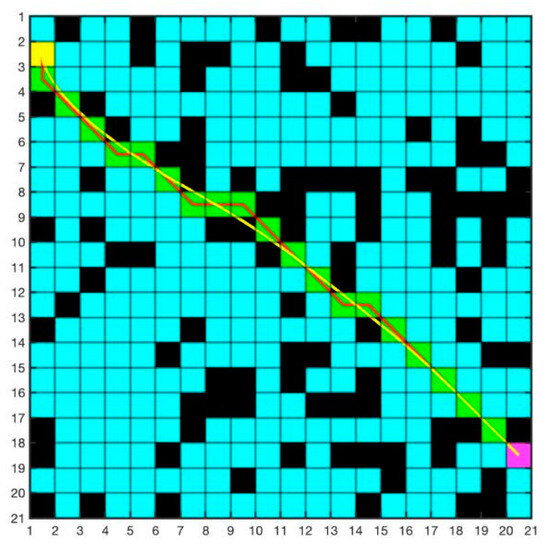 After Bezier optimization (Figure 13a), the path has achieved the smoothing goal, but there are still obvious problems in obstacle avoidance. After the sprcv improvement optimization, we have obtained a smooth and highly successful obstacle avoidance path (Figure 13b). In Figure 13, the red path is the shortest path found by the improved artificial bee colony algorithm in the 2D grid environment, the yellow path is the smooth path after the Bezier optimization curve, and the blue path is the smooth path after the improved sprcv curve optimization. By comparison, the path after Bezier curve optimization may encounter obstacles that cannot be avoided. Therefore, improved sprcv is added to improve the smoothness of the path and obtain an optimal path with high smoothness and safe obstacle avoidance.