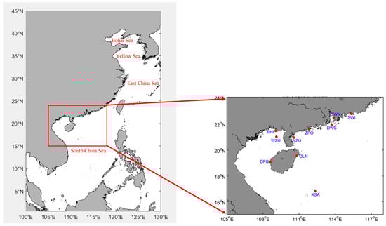 Map of the Northwest Pacific region. The study area is indicated by a red rectangle (left). Geographical location of the 10 tidal stations along the SCS coast (red dots) (right). Full names and time spans of the 10 tidal stations used in our study are shown in Table 1.