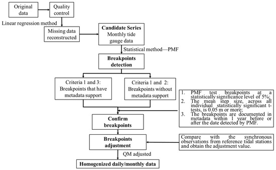 Non-climatic reasons, such as station relocation and equipment changes, can have long-lasting effects on observation data, leading to the occurrence of inhomogeneity breakpoints in climatic series. These breakpoints can be effectively identified through the utilization of inhomogeneity detection on monthly mean series and metadata verification [23]. Therefore, we performed homogeneity detection on the monthly mean sea level series to obtain the breakpoints. Then, combined with metadata, we identified breakpoints after comprehensive judgment. The quantile-matching (QM) method was used to calibrate the hourly and daily data with verified breakpoints 3 [24,25]. The homogenized monthly mean sea level series was calculated from the homogenized daily mean sea level. Below is the flow chart of the homogenization process (Figure 2).